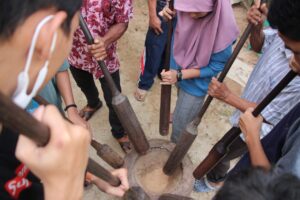 Dahulu musim panen merupakan waktu yang ditunggu-tunggu oleh masyarakat, sebagian dari hasil panen tersebut disimpan di lumbung padi dan sebagian diolah secara tradisional. Pengolahan secara tradisional yang dilakukan oleh masyarakat menggunakan alat lesung besar yang terbuat dari kayu belian atau batang meghis yang berukuran besar dan untuk menumbuknya digunakan beberapa anak alu yang juga terbuat dari batang kayu yang sama.