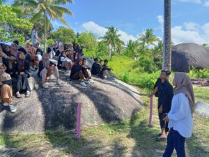 Pada kesempatan ini, Natuna Geopark Youth Forum (NGYF) berkolaborasi dengan Dinas Pariwisata Kabupaten Natuna menyampaikan informasi dan materi Geopark, khususnya Geopark Natuna di Geosite Batu Kasah kepada sejumlah 42 orang peserta Jambore. Memanfaatkan batuan besar yang terhampar di Geosite Batu Kasah, penyampaian ini dilakukan secara interaktif dan santai dengan para peserta duduk di batu yang ada.